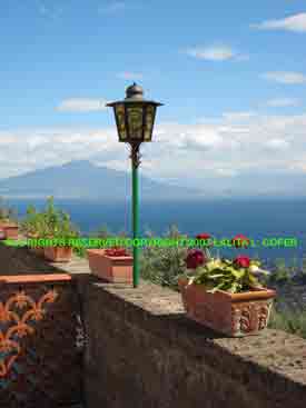 The location of this painting is the 'Ornella Villa', and the quaint apartment overlooking the farms and lemon orchards in the tiny village of Priora, situated in the hills above the Sorrento.  The Ornella Villa's terrace is what all terraces should be with an incredible view down the valley to Sorrento, the bay of Naples and Vesuvius  tranquil and serene in the distance....The Villa's beautiful gated drive is bordered by roses whose blossoms are the size of a luncheon plate.  The owner  'Angela' has a penchant for Snow White and the 7 Dwarfs; and the colorful but incongruous statuettes dot the drive and the grounds. One falls in love with the beauty and charm of the 'Villa Ornella' and the country side, especially in the spring when flowers are blooming everywhere and Italy and Sorrento are most enchanting.